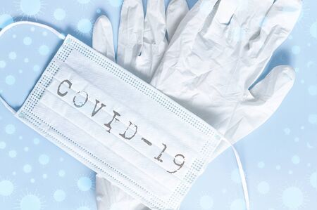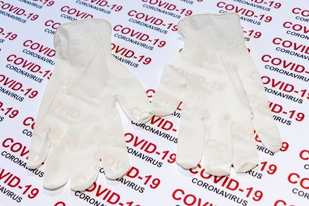 Medical sterile gloves on Covid-19 background. Coronavirus protection concept.