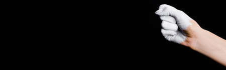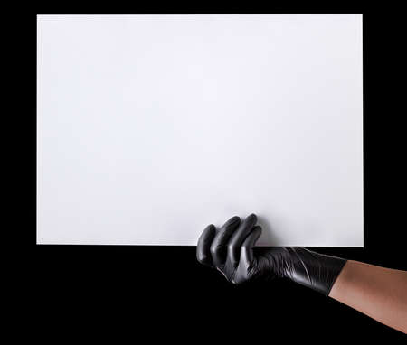 Hand in black gloves showing or holding blank cardboard isolated on black background. Isolated with clipping path.