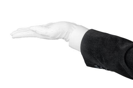 Close up of open man hand in black suit and white glove holding or supporting something. Isolated on white background with clipping path