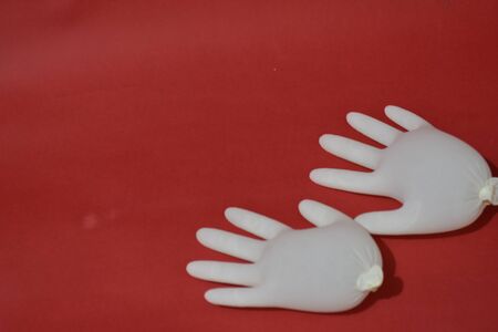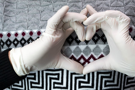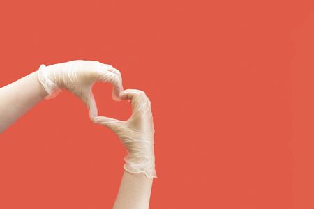 coronavirus concept hands wearing latex gloves creating a heart shape on a red background
