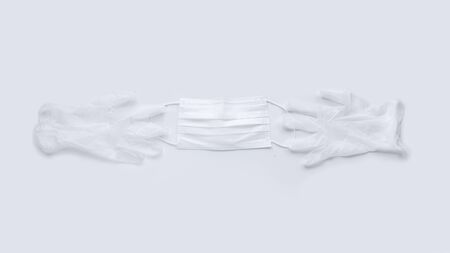 White protective medical mask and gloves on gray background. Banner of flu coronavirus Covid-19 and quarantine concept. Stock photo.