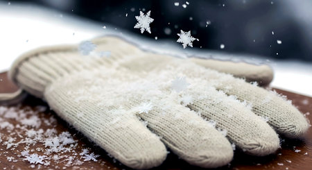Gray knitted gloves on a blue background with snowflakes. A stylish accessory for cold weather.