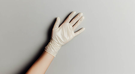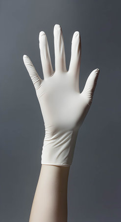 Female hand in white latex glove, on flat gray background, close-up, copy space.