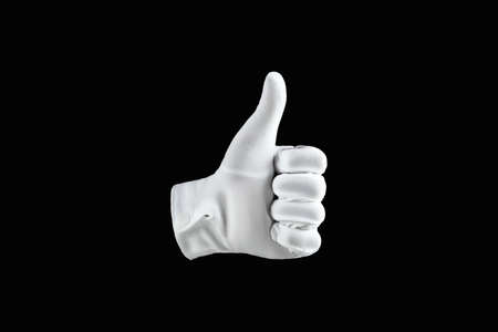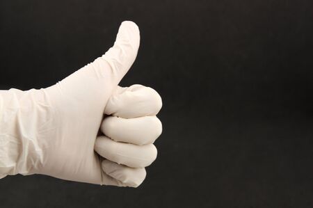 A fist with a latex glove with thumb up, black background and space for texts (copy text)