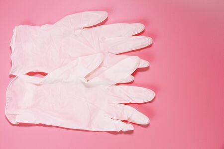 Two white medical gloves on a pink background. Sterile latex gloves. Medical glove for protection and patient care. Pink background.