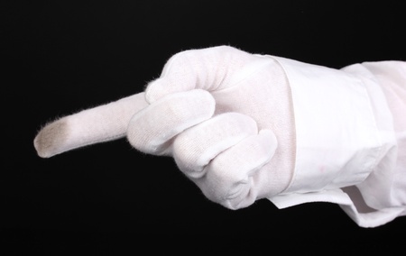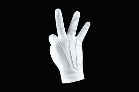 A white gloved hand isolated on black background. American sign language alphabet B.
