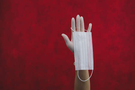 White medical mask hangs on the hand with a white surgical glove. preventive measures against respiratory illness and virus. red background with copy space