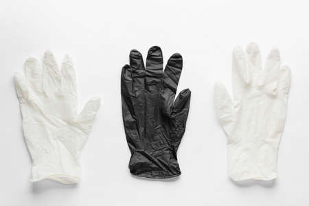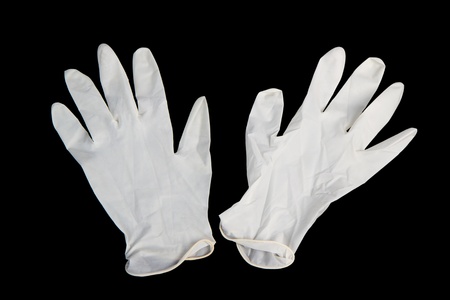 Pair of two medical white rubber gloves on black background. Disposable gloves concept for health care and medical procedures.