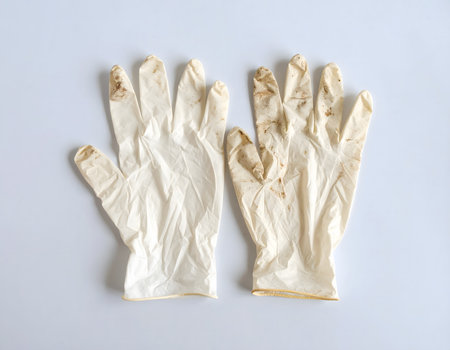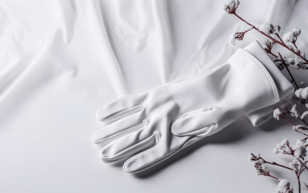 Sterile medical gloves are positioned in a circular pattern around a central point against a white background, emphasizing cleanliness.