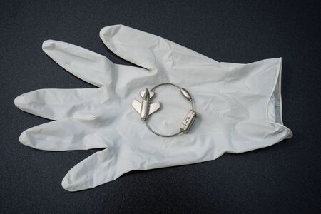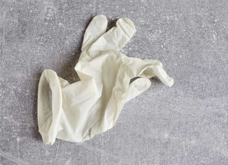 White protective medical glove on gray background. Banner of flu coronavirus Covid-19 and quarantine concept. Stock photo.
