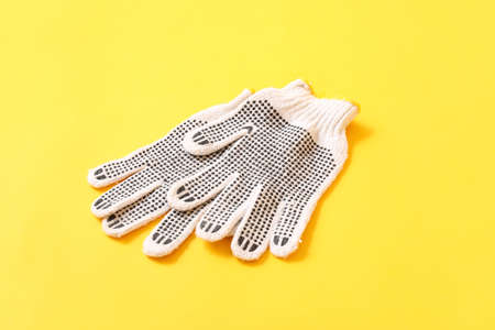 Gardening gloves on a yellow background. Work gloves on a yellow background. Yellow background. An article about dirty work. Hand protection. Copy space