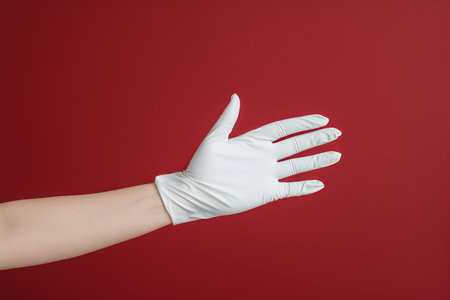 Latex medical glove shaped like a human hand set against a vivid red background. represents themes of healthcare, safety, hygiene, and protection. useful for medical industry visuals, safety campaigns, and health-related promotions. Generative AI