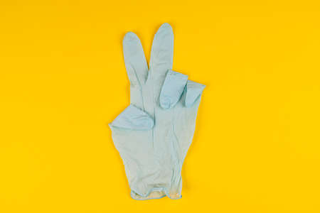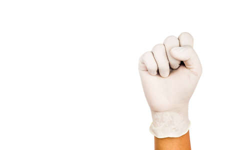 Man's hand with nitrile gloves for medicine making gesture of peace and love. isolated on white background.