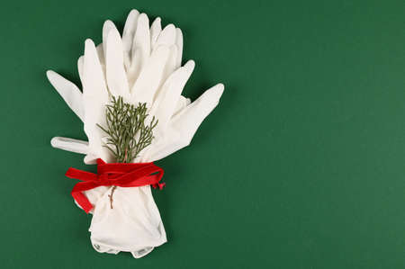 Many medical gloves tied with a red velvet band. Unusual gift, coronavirus COVID-19 concept.