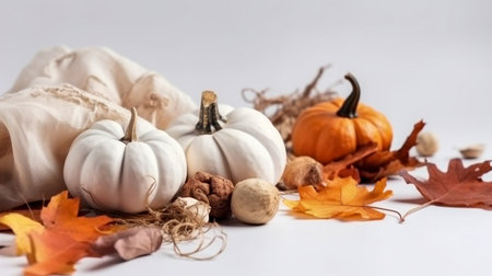 Autumn composition with pumpkins, leaves and nuts on white background