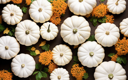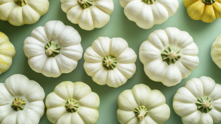 White pumpkins on green background, autumn harvest pattern. Natural and organic food concept