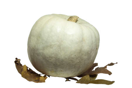 Small white pumpkin with autumn leaves on white