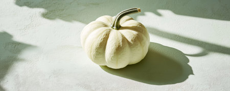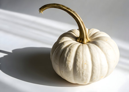 White pumpkin with curved stem casts shadow on bright surface in a studio setting today