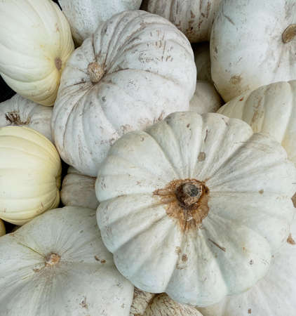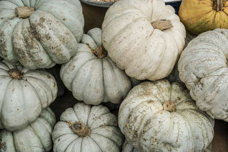 White pumpkins and squash at fall harvest.