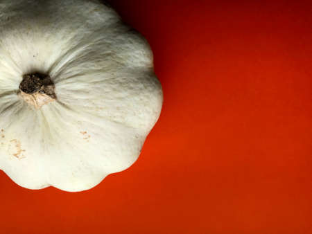 White pumpkin on orange background. Autumn banner with pumpkin. Recipe banner for seasonal cooking class. Thanksgiving wallpaper background. Harvest festival. High quality photo