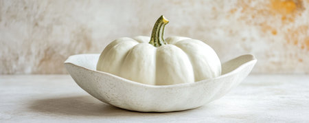 White pumpkin in decorative bowl on textured background, minimalist autumn decor concept