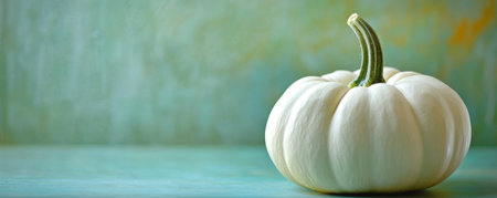 Elegant white pumpkin in the corner on clean light background. Invitation mockup, copy space. Generative AI.