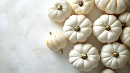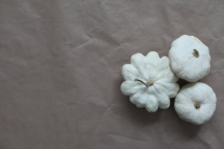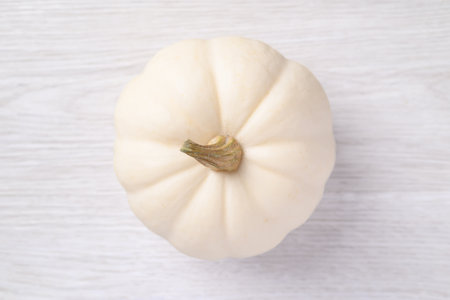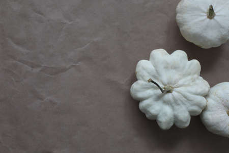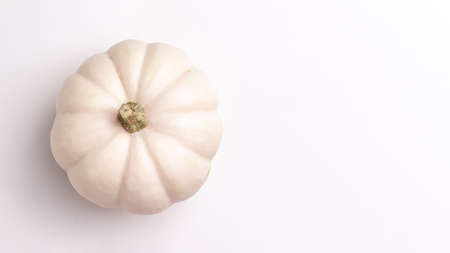 Flat lay of mini decorative white pumpkin on bright background from above at the left. Halloween and Thanksgiving greeting card holiday concept with copy space
