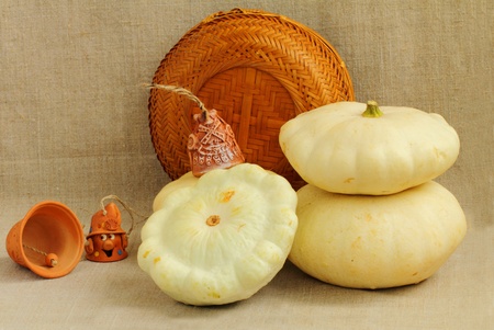 Three scallop squashes, handbells and a straw basket on the linen cloth