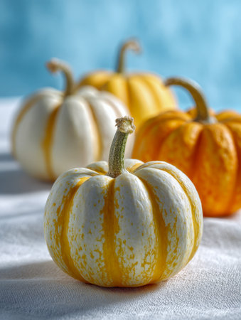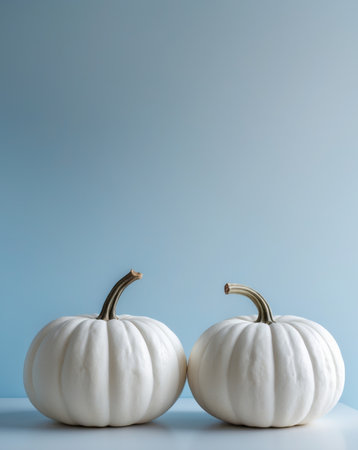 AI Generated. there are two white pumpkins sitting on a table with a blue background