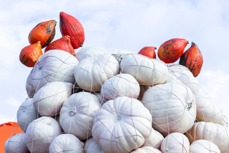 A pile of white pumpkins and on top of them a pile of orange pumpkins against a blue sky.
