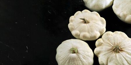 Group of white pattypan squash on black board, space for text left side.