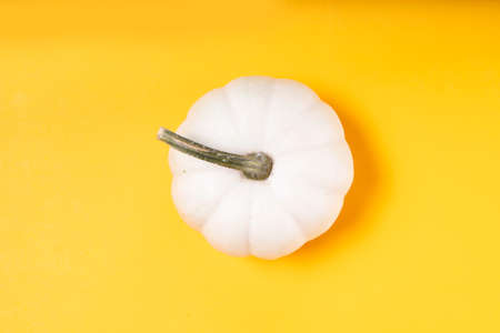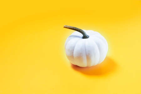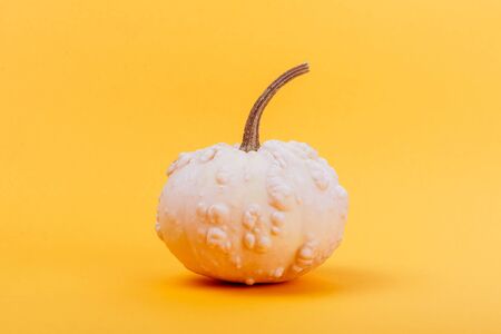 Close-up of white pumpkin on yellow background with copy space