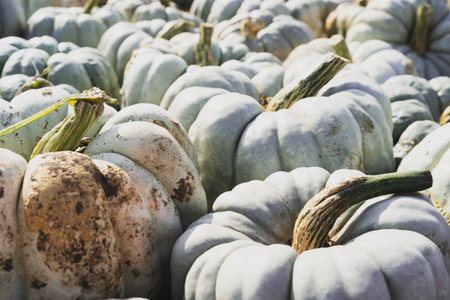 Full frame close up view of large ripe white Jack O' Lantern size pumpkins with defocused outdoor background and copy space