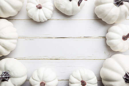 Autumn frame made of white pumpkins and squashes top view, copy space. Fall, Thanksgiving concept.