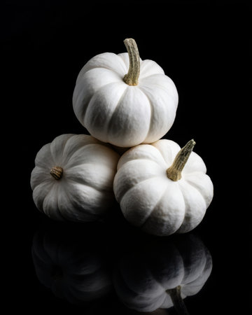 Three white pumpkins with distinct ribs and brown stems are stacked together on a reflective surface.