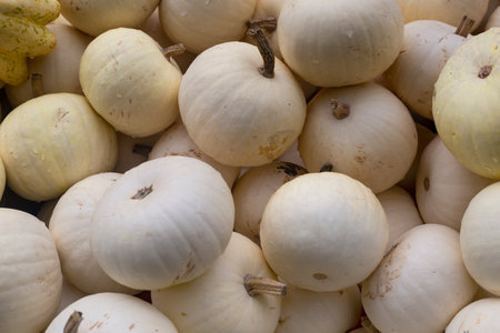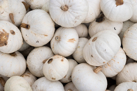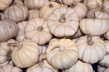 Lots of decorative white mini pumpkins at the outdoor farmers market. Top view, flat lay.