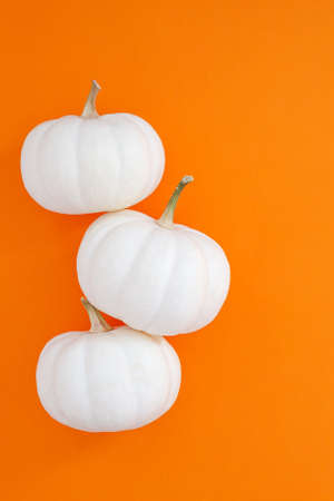 Banner of mini decorative white pumpkins on the left on orange background with copy space. Halloween and Thanksgiving greeting card holiday concept