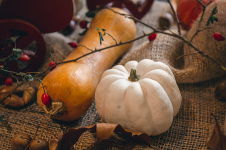 Autumn composition with pumpkins on burlap close-up.