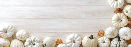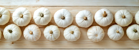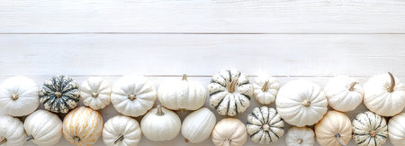 A horizontal border of white pumpkins and gourds arranged on a rustic wooden background, perfect for autumn and Halloween decor.
