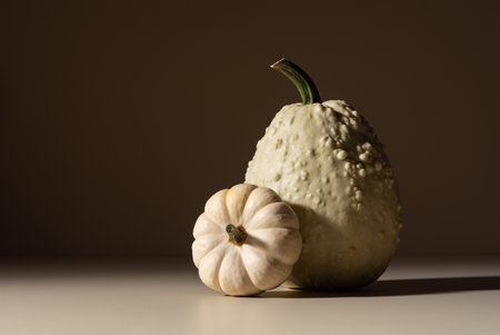 Minimal still life of two decorative pumpkins in warm studio light. Natural tones, calm mood, and simple composition reflecting autumn, sustainability, and slow living aesthetics.