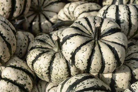 Striped pumpkins background, green and white squashes in a pile. Edible pumpkins.