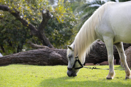 A majestic white stallion grazes peacefully in a lush green field. The horse is standing under a shady tree with palm trees in the background, creating a serene and idyllic scene.