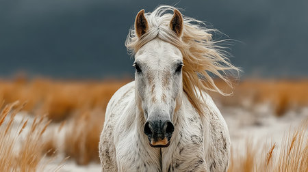 A beautiful white horse stands proudly with its long mane cascading. The soft pink background highlights its elegance and grace in this serene moment.