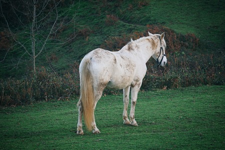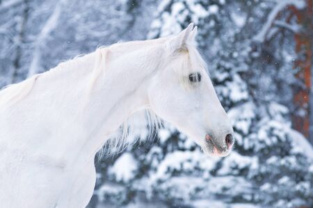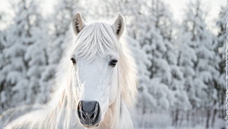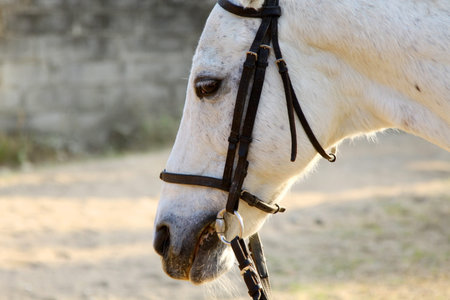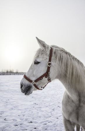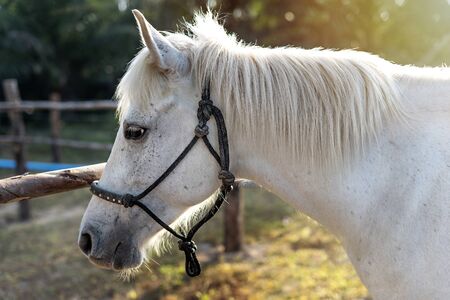 Portrait of a beautiful white horse with a halter on its muzzle and a white mane, which is illuminated by sunlight on a foggy morning. Equestrian life.