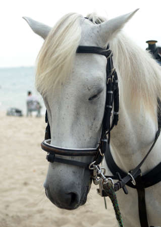 Portrait of closeup white arabian horse on beach in Hua Hin, Thailand.