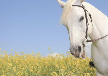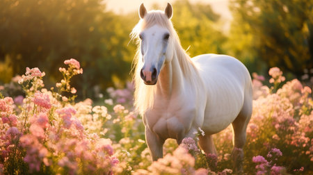 Cute, beautiful white horse in a field with flowers nature, in sunny pink rays. Environmental protection, nature pollution problem, wild animals. Advertising travel agency, pet store, veterinary clinic, phone screensaver, beautiful pictures, puzzles
