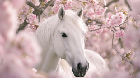 White horse up close, surrounded by delicate sakura blossoms in a radiant spring garden