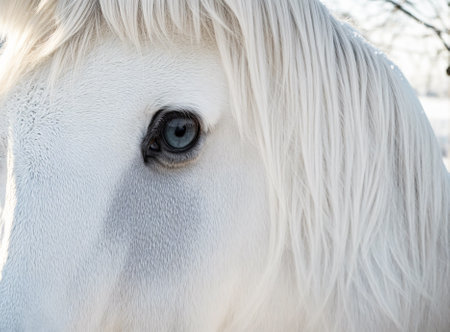 a white horse looking at the camera with its head slightly to the camera and its eyes are open