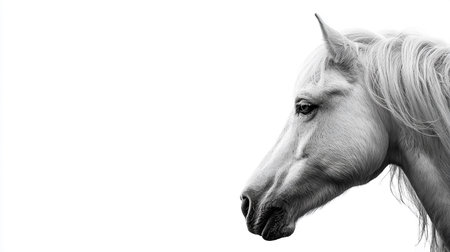 This stunning portrait showcases a white horse with a flowing mane, creating a serene and elegant atmosphere against a soft pink background. Ideal for animal lovers.