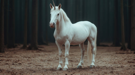 A majestic white horse stands in soft morning fog across an open field. Pastel tones and cinematic lighting create a peaceful, minimalistic mood perfect for editorial, fine art, and equestrian visuals.